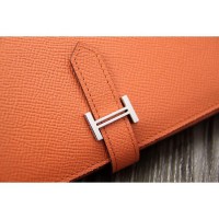 Presenting the Hermes Bearn Wallet. It's a long wallet with a simple exterior design, but the silver 'H' logo on the strap and gusseted compartment is enough to make us drool. It is the most elegant way to organize your essentials like your bills, currency, credit cards and plenty of coins. This stunning piece will always be a timeless classic.