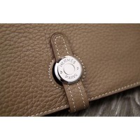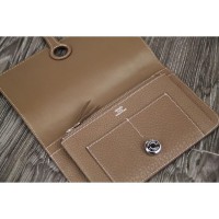 Presenting the Hermes Dogon Wallet. The Dogon Wallet features a leather strap and "Clou de Selle" tab closure. The tab is a circular shape with 'Hermes Paris' engraved on it. This wallet comes from Combined style,which includes a removable zipped coin purse. It has 5 credit card slots, a pocket for bills and 2 extra pockets. The design looks quite easy and our eyes are pointing to the silver plated closure in the center. It is the most convenient way to organize your essentials like your bills, credit cards, coins and more.